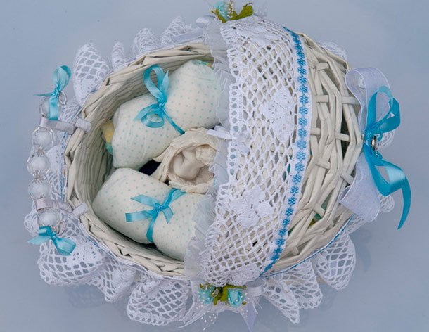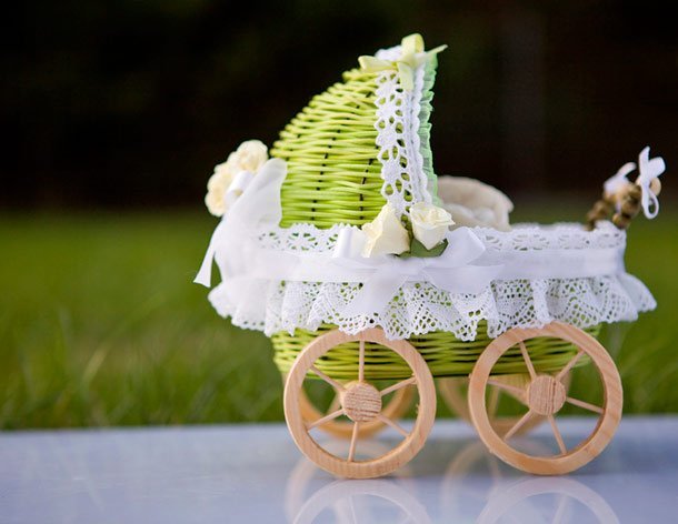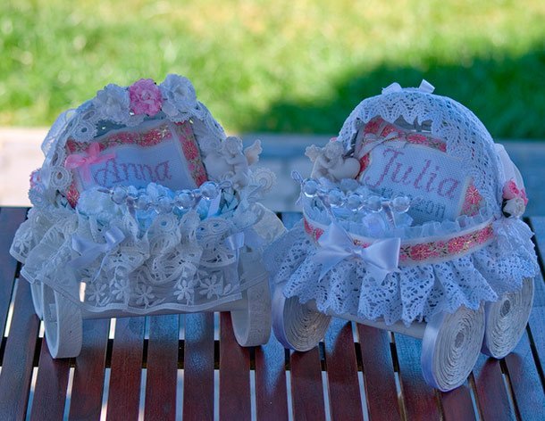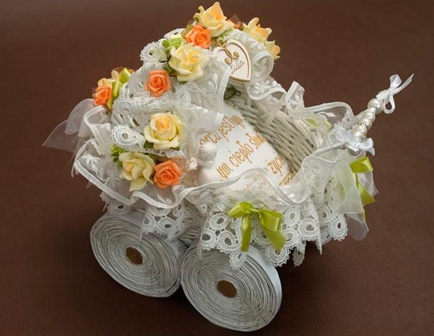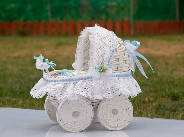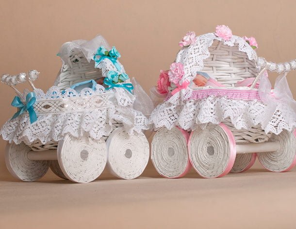 Anna Krucko é uma artesã Russa muito talentosa e trouxe essa ideia de carrinho para presentear recém nascidos. É todo feito basicamente de Arame e Jornal, e claro, muita criatividade na hora dos detalhes com fitas e pedrarias. Você pode rechear o interior dos carrinhos com fraldas e brinquedos e mimos, e o que mais sua imaginação mandar.