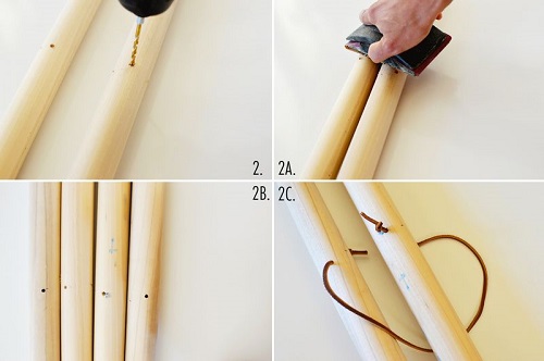 Construa seu próprio cabideiro-001FURANDO E LIXANDO A MADEIRA: Nesse processo, pegue a furadeira e faça furos por onde vamos introduzir as cordas e sustentar os cabos pela parte de baixo. A corda deverá ser o suficientemente resistente para que não se rompa quando montar a estrutura. Também, lembre-se que a corda de união ficará visível, portanto escolha uma que além de resistente, seja do estilo que você mais gostar para combinar com seu armário. No exemplo foi utilizada cordinhas de couro que resultou numa estética moderna e audaciosa! Depois de fazer os furos, volte a usar a lixa para deixar a madeira bem lisa.