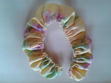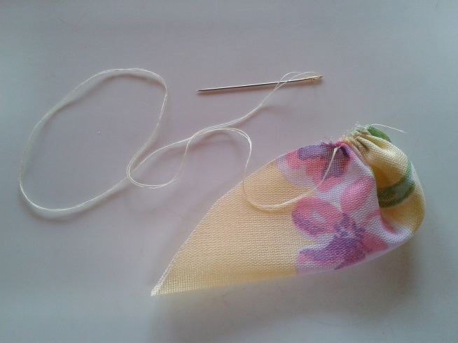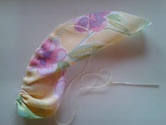 3- Dobre o tecido ao meio e faça um franzido até a metade.4 – Posicione a 2ª pétala sobre a 1ª, alinhavando a curvatura e continue a costurar o franzido.5 – Continue alinhavando as demais pétalas até concluir as 10, deixando um leve franzido. Não puxe demais. No final de um pontinho para firmar a costura. 6 -Para formar a rosa enrole as pétalas em volta do dedo indicador com a base franzida na ponta do dedo. De um pontinho para a rosa permanecer fechada.Peça Finalizada